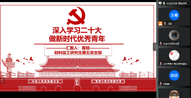 各支部通过小角度切入,多角度论证,将“大理论”和“小故事”相结合,以小见大,寓情于理。材料学第二党支部和材料加工第四党支部讲述华中科技大学老校长杨叔子先生诗礼传家,丹心热血,拳拳报国,“科学人文总相宜”的教育理念;材料学第十党支部和材料加工第八党支部以新时代下榜样力量生动事例诠释何为“二十大精神”,并倡导大家积极学习;材料学第一党支部以“九个问题”,结合自身讲解关于二十大报告的理解;材料加工第二党支部立足课题组当前科研发展动向,阐述“绿色发展”理念;材料加工第五和第十一党支部号召大家争做新时代优秀青年,既要拒绝“内卷”,更要拒绝“躺平”,见贤思齐,奋发向上。