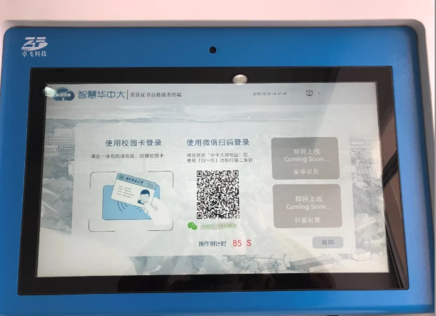 点击主界面“荣誉证书”按钮即可登陆,目前有两种登录方式:①刷校园卡,②微信扫码(微信需绑定“华中大微校园”)。