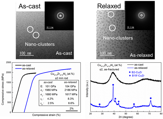 成果简介:本成果对比了一种结构不稳定非晶的铸态及弛豫态的微观组织、发现弛豫热处理后的非晶里出现了大量的纳米级团簇,并且弛豫后的非晶表现出了由于铸态的塑性及强度,完全不同于以往的弛豫致脆的观念。通过对断面的分析,变形过程中较少剪切带形成带来的较高剪切带温度会引起变形过程中的晶化,对弛豫态的反常塑性化起到贡献作用