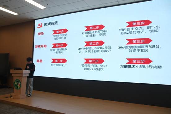 为增进彼此的了解,加强专业间的交流互鉴,本次主题党日组织了明信片交流活动。本次活动将全体党员分为七个小组,小组内成员可以相互认识交流。15分钟后,每组随机抽取一名同学,其需要介绍组内其他成员的姓名和学院。随后,每组派代表轮流回答一个问题,问题与三个学院分享的科研故事有关。答题期间各同志兴致高昂,积极参与,最终第一组同学获胜。此次明信片交流活动充分调动了大家的积极性,增进了不同学院党支部之间的交流,在交流中增进了彼此的友谊。
